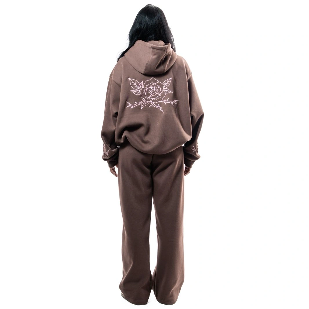 The Eskecy Gulabi Set is a Vintage Brown Hoodie shrouded in the color "Gulabi". Featuring a rose on the back and sleeves. With Eskecy written in bright, bold color up-front.