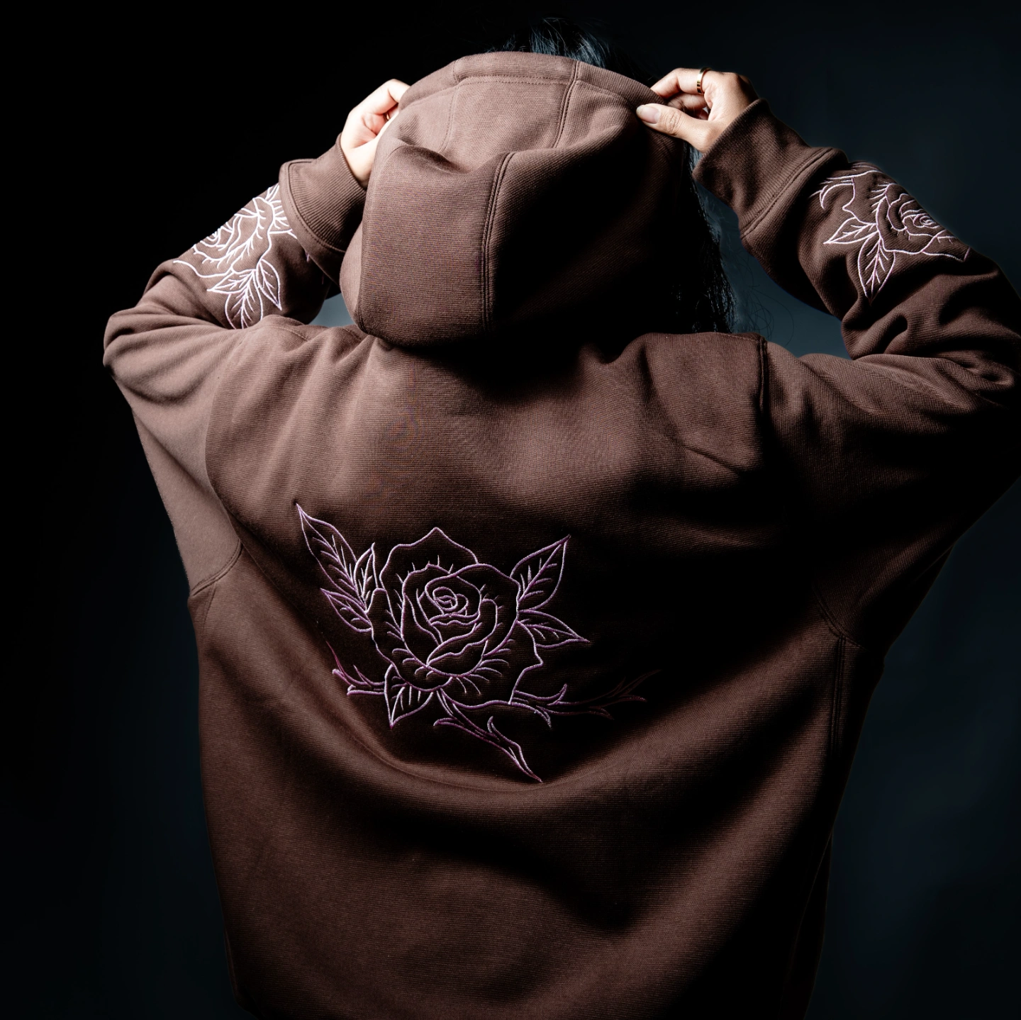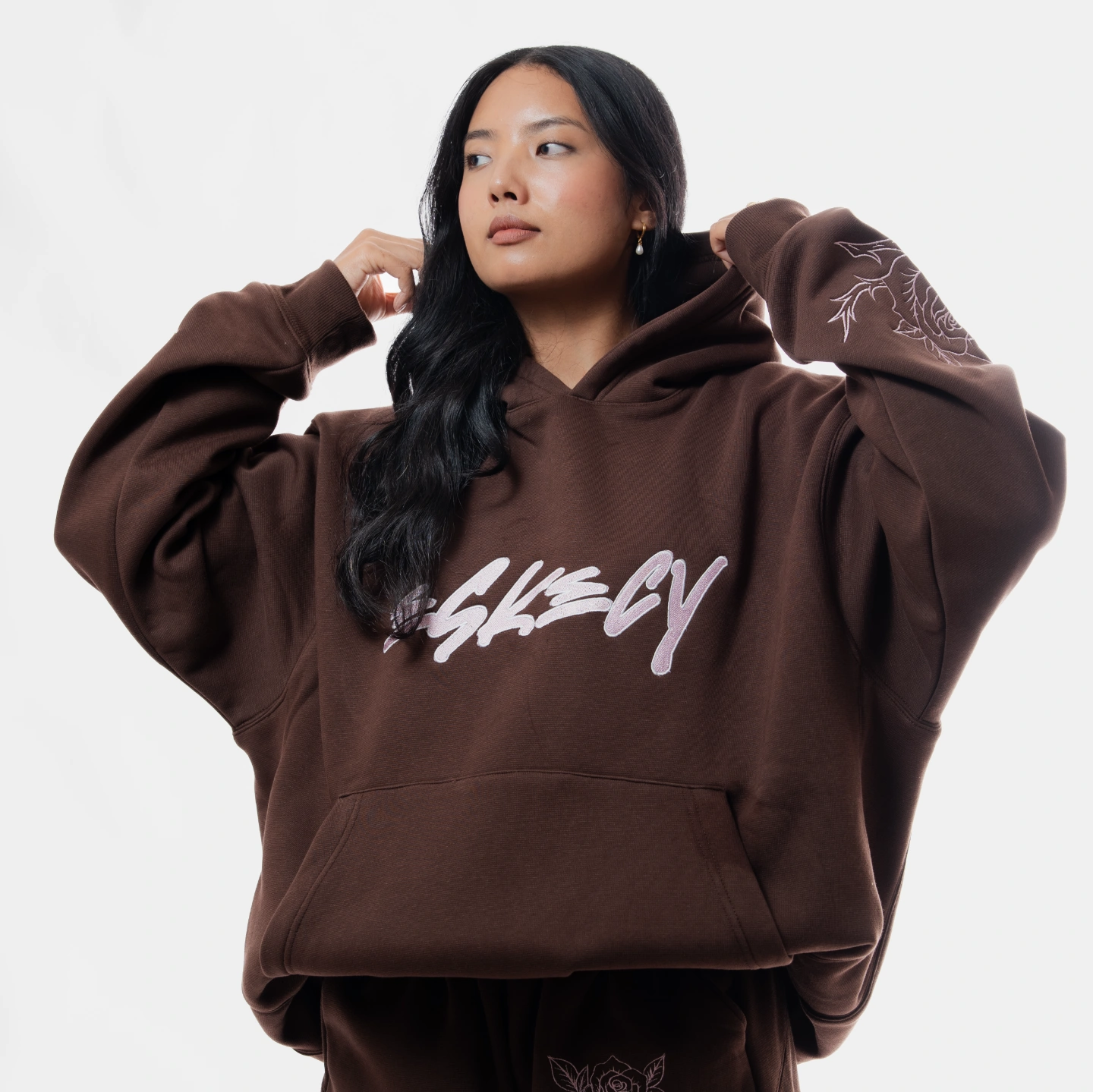 The Eskecy Gulabi Set is a Vintage Brown Hoodie shrouded in the color "Gulabi". Featuring a rose on the back and sleeves. With Eskecy written in bright, bold color up-front.