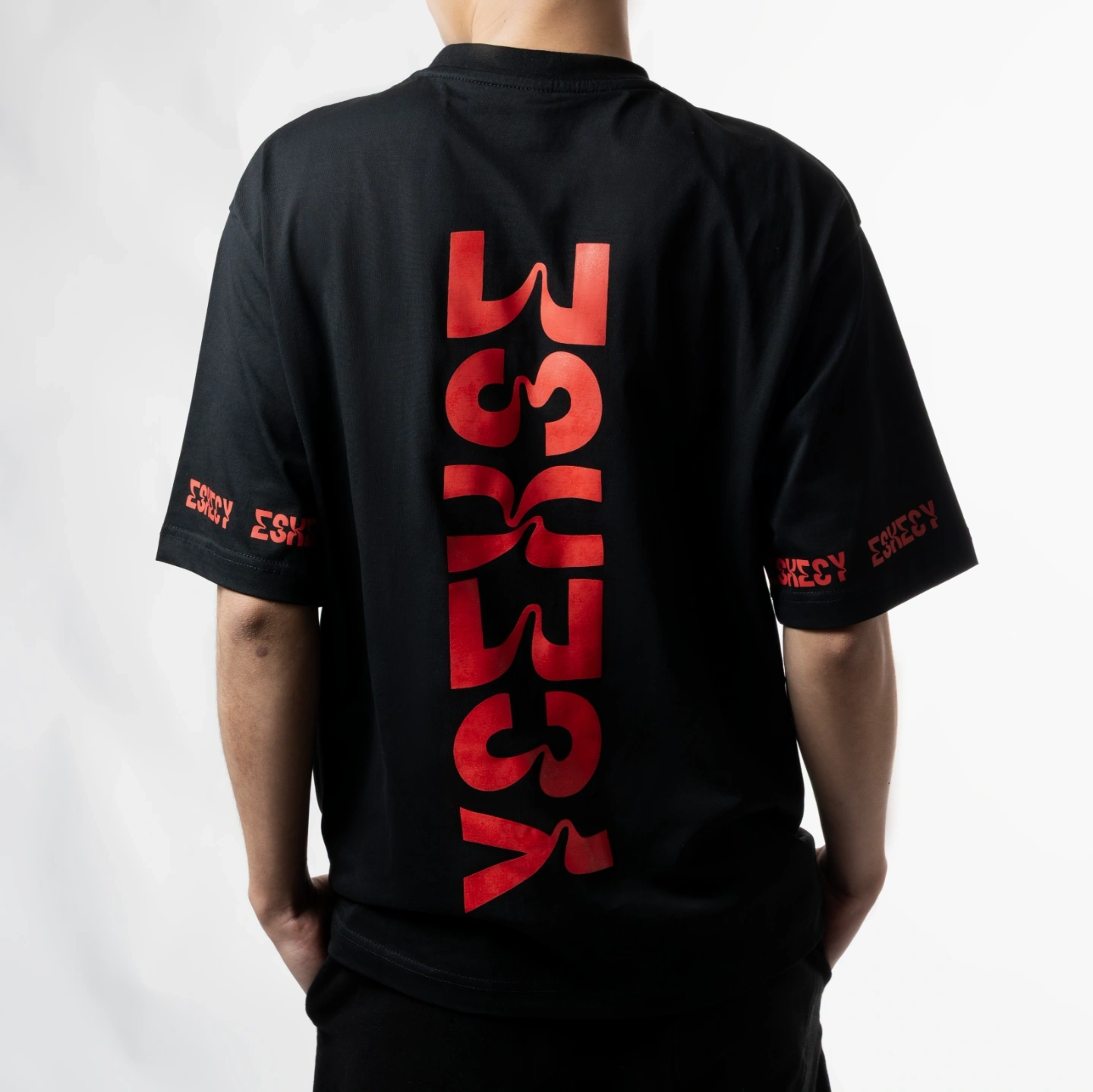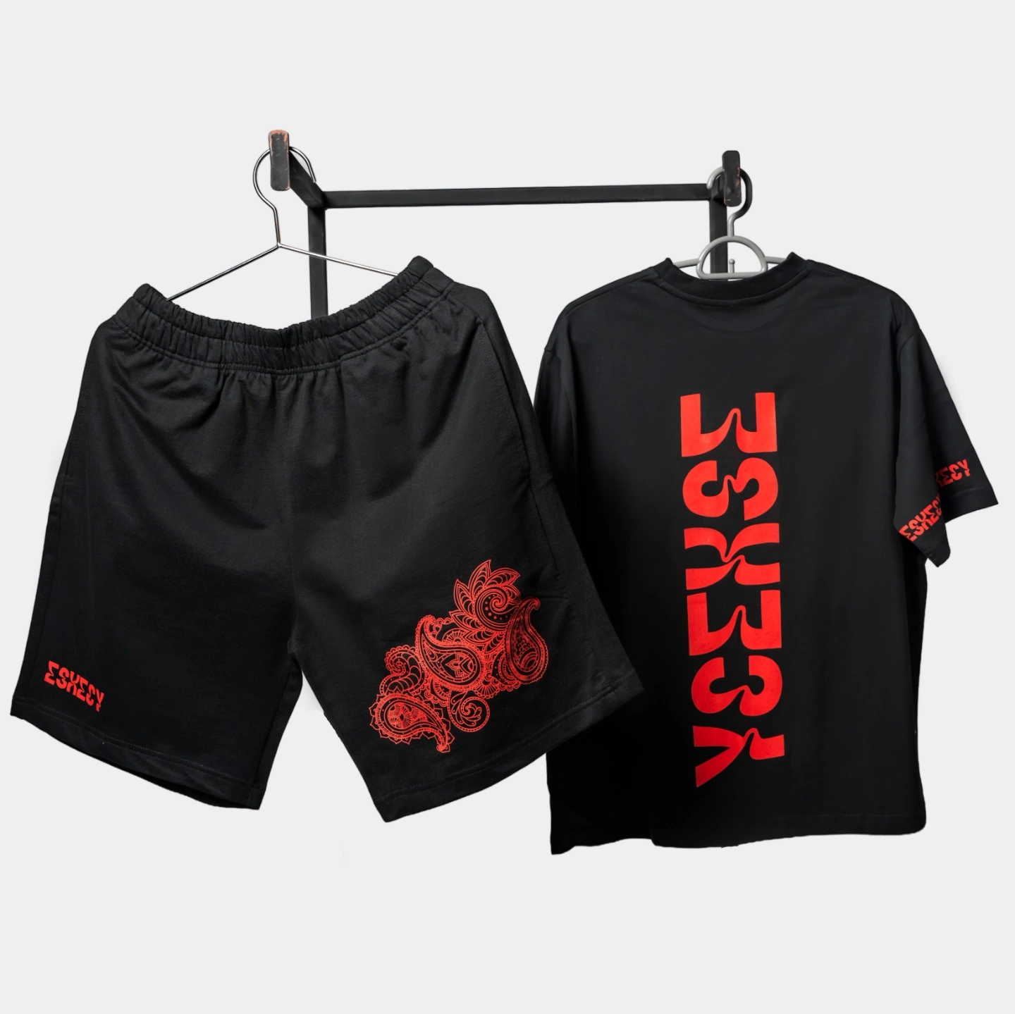 Double-branded "ESKECY" wraps in deep red on both cuffs for a distinctive profile view. Cut for a relaxed, modern fit with an elasticated waistband. The crimson paisley artwork is featured on the left leg, balanced by a minimal ESKECY hit on the right.An oversized, heavy-weight silhouette featuring the signature vertical ESKECY block logo on the back. The letters are overlaid with a detailed, crimson-red paisley motif, creating a bold fusion of geometric branding and organic patterns.