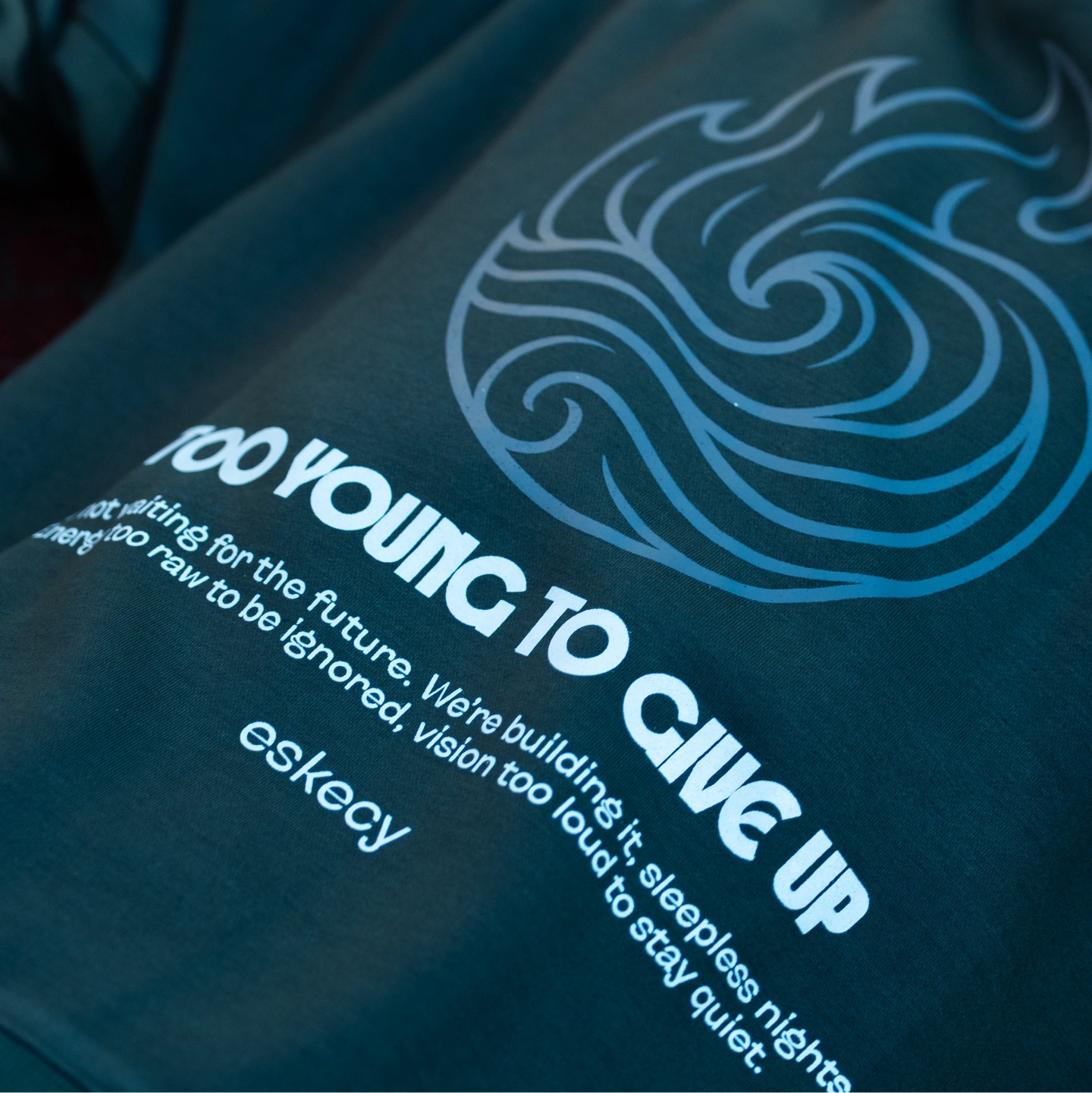 Bold, street-ready, and built for momentum. This deep forest‑green pullover hoodie features a large matte‑grey “fire & wave” emblem centered on the back with the headline slogan: “TOO YOUNG TO GIVE UP.” A motivational text block sits beneath the graphic, finished with the eskecy wordmark for a crisp, minimal brand hit. The oversized back print contrasts against the rich green fabric for a striking, high‑impact look.