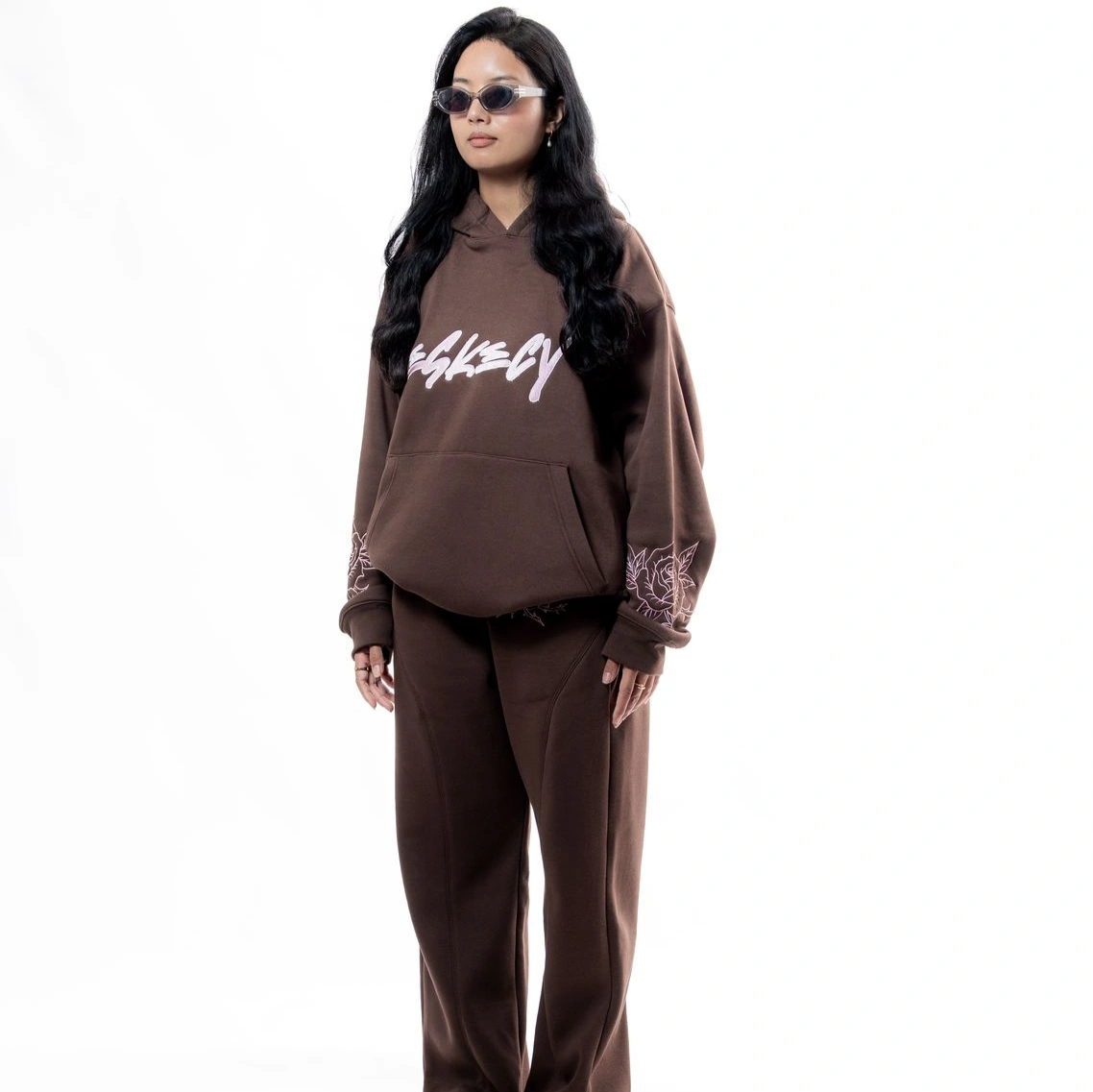 The Eskecy Gulabi Set is a Vintage Brown Hoodie shrouded in the color "Gulabi". Featuring a rose on the back and sleeves. With Eskecy written in bright, bold color up-front.